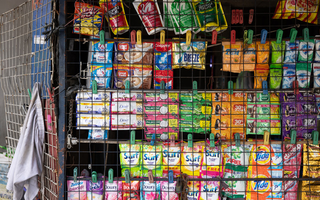 Sachet items match the “pangkalahatang budget” of daily-wage households. Low cash on hand means customers buy only what they need for the day.
